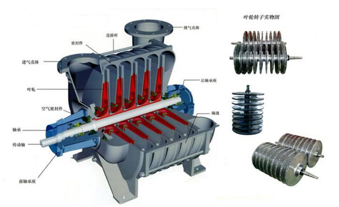 離心鼓風機依靠葉輪旋轉對氣體的作用把電機的機械能傳遞給氣體。由于離心鼓風機的作用,氣體從葉輪進口流向出口的過程中, 其速度能(動能)和壓力能都得到增加,被葉輪排出的氣體經過壓出室,大部分速度能轉換成壓力能,然后沿排出管路輸送出去,這時,葉輪進口處因氣體的排出而形成真空或低壓,氣體在大氣壓的作用下被壓入葉輪的進口,于是旋轉著的葉輪就連續不斷地吸入和排出氣體。